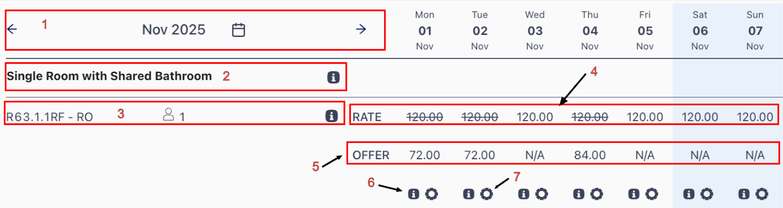 | (6) ℹ️ Cancellation Policy | Hover to view the cancellation policy applicable for that rate plan and date. |